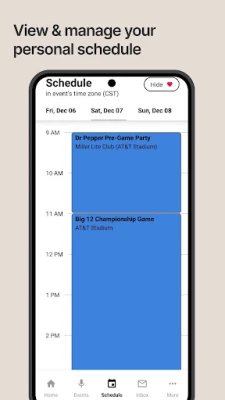 Welcome to the official mobile app for the 2024 Dr Pepper BIG 12 Championship Weekend in Arlington, TX! Download the app to elevate your onsite experience and stay informed about all the exciting events throughout the weekend. Be sure to enable push notifications so you never miss an update during your time at the event.