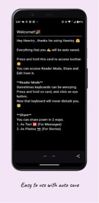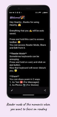 - Shareable images: Directly share poems/stories on various social media platforms as images. Easily change the font size, font colour and background gradient of the images.