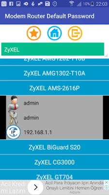 The application only contains factory default passwords. The information of all the modem and router is collected in this application. There are over 450 modem and router devices. There are over 3000 modem and router model, username, password, ip information. It's easy to use.