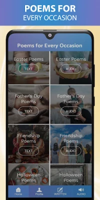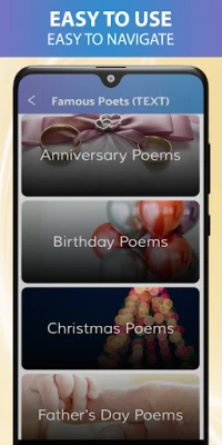 Everyone loves to celebrate and make special occasions even more memorable. This app aims to help people find the right words, greeting cards, poems, poetry, messages, sayings for those special moments. This app helps elevate your expression of words from our collection of poems that will make your loved ones smile. With our app, you'll never be at a loss for words again. Whether you need a wedding poem, a Mother's Day or Father's Day message, a love poem, or anything in between, we have it all.